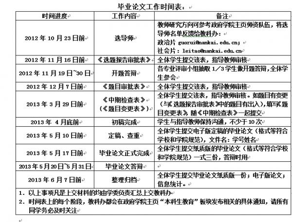 1. 学生应于2013年4月底在指导教师的指导和修改下完成论文初稿。5月10日前,应彻底完成定稿,学习委员收齐班级定稿的电子版(文件名:学号姓名,例:0815999张三)打包发送至guorui@nankai.edu.cn用于抄袭检测,相似度超过20%,需做出说明;一旦认定为抄袭,毕业论文成绩为零分,取消当年毕业资格。