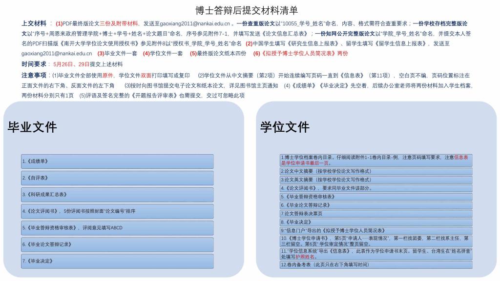 博士答辩通过后需要及时准备各种毕业及申请学位的材料,需要提交的材料清单如下: