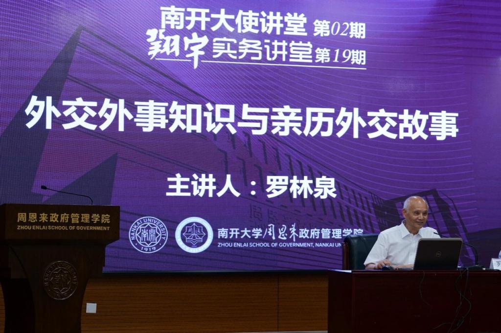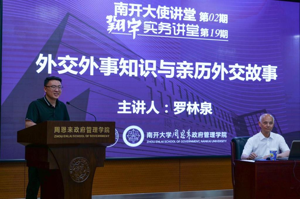 2025年6月5日,南开大学周恩来政府管理学院“南开大使讲堂”第2期暨翔宇“实务讲堂”第19期在政府管理学院128报告厅举行。本期讲座特别邀请了外交部礼宾司原司长、前中国驻纽约总领事馆副领事、前外交部驻香港特别行政区特派员公署参赞、前中国驻希腊共和国特命全权大使、前中国驻爱尔兰特命全权大使、前中国驻旧金山总领事(大使衔)罗林泉大使,以《外交外事知识与亲历外交故事》为主题,为现场师生带来了一场精彩的讲座。政府学院党委书记王慧、副院长张发林教授、刘兴华教授、王耀辉博士和李圣达博士等出席。本次讲座由张发林教授主持,近百名南开师生参加,现场气氛热烈。