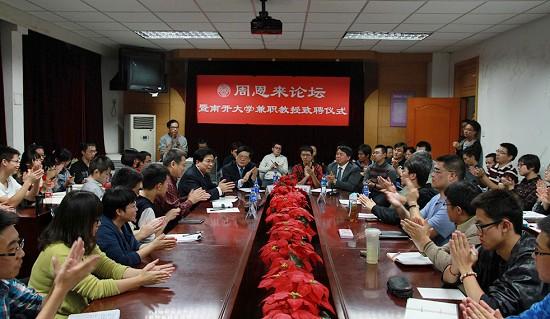 10月12日,北京大学国际关系学院院长、中国国际关系学会副会长王缉思教授受聘南开大学兼职教授并做客“周恩来论坛”,南开大学副校长佟家栋向王缉思致送聘书并佩戴校徽。活动由周恩来政府管理学院负责人主持。周恩来政府管理学院部分师生代表参加本次活动。