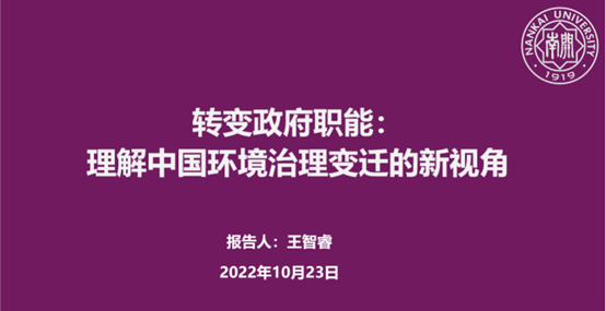 王智睿同学汇报了《转变政府职能:理解中国环境治理变迁的新视角》一文。该文从转变政府职能的视角来认识中国环境治理,尝试从中观层面为环境治理改革的制度逻辑寻求具有解释力的分析。