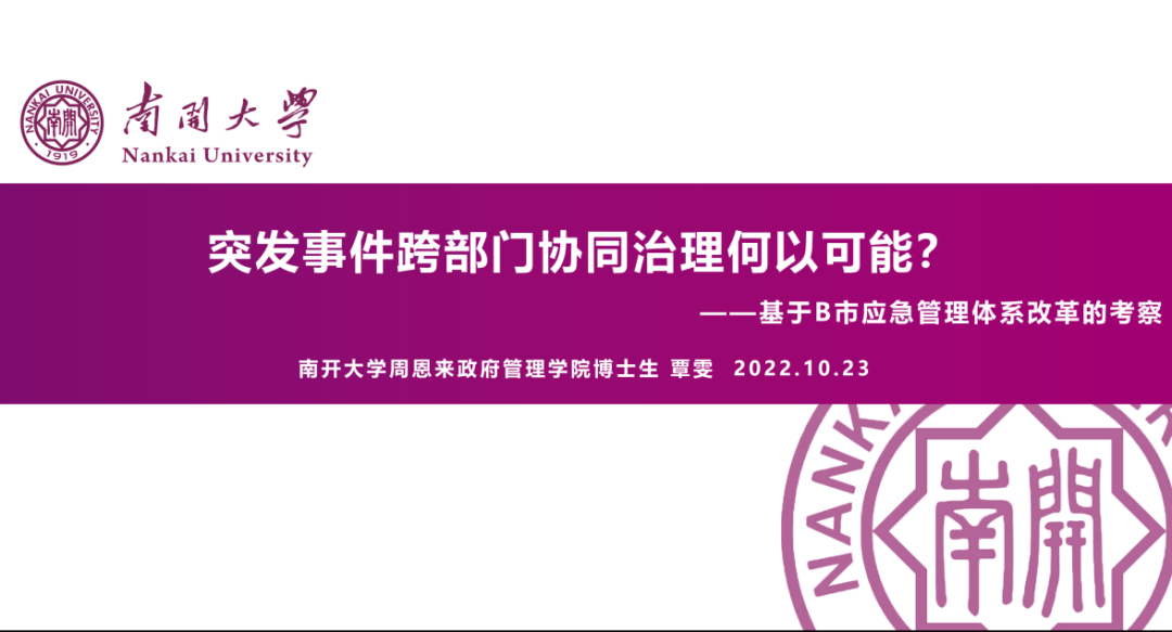覃雯同学汇报了《突发事件跨部门协同治理何以可能? ——基于B市应急管理体系改革的考察》一文。该文基于B市应急管理体系改革实践,采用扎根理论研究方法从“结构——过程”视角分析了突发事件跨部门协同治理成功的机制。