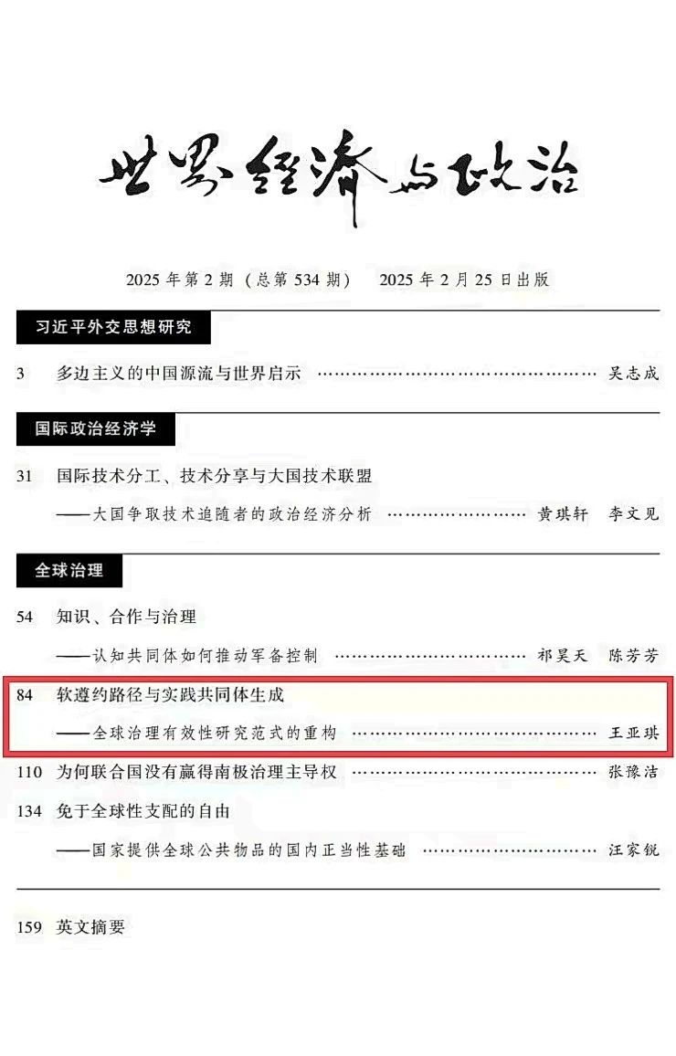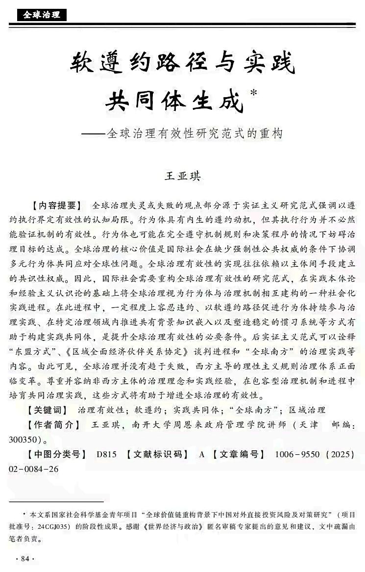我院教师王亚琪在《世界经济与政治》刊文“软遵约路径与实践共同体生成——全球治理有效性研究范式的重构”