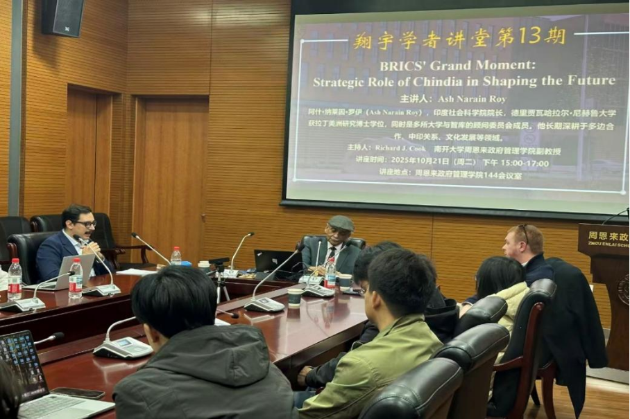 2025年10月21日下午,南开大学周恩来政府管理学院翔宇学者讲堂第13期,BRICS' Grand Moment: Strategic Role of Chindia in Shaping the Future在周恩来政府管理学院144会议室成功举办。本次讲座特邀印度社会科学研究院院长、资深教授、知名国际政治学者、多所大学与智库的顾问委员会成员Ash Narain Roy老师主讲。周恩来政府管理学院Richard J. Cook副教授主持,柳建文教授、吴亚博老师参加,共同聚焦历史回归与世界失序这一牵动全球格局的核心议题,围绕地缘政治变革、全球治理转型等议题展开深度对话,探讨中印双方在塑造未来中的战略作用,碰撞出跨文明视角下的思想火花。