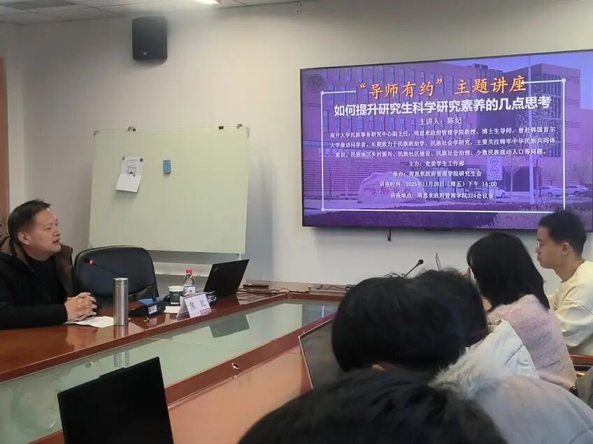 2025年11月28日,由南开大学党委学工部主办,周恩来政府管理学院研究生会承办的“导师有约”系列学术讲座于学院324会议室顺利开展。本次学术讲座邀请到了南开大学民族事务中心副主任、周恩来政府管理学院政治学系陈纪教授,为我们带来题为《如何提升研究生科学研究素养的几点思考》的主题讲座。
