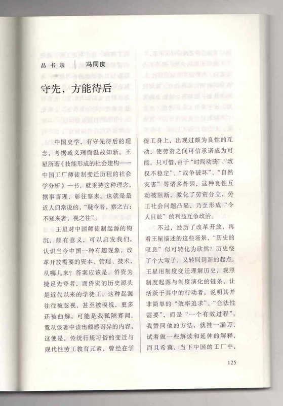 我院社会工作与社会政策系王星副教授的专著《技能形成的社会建构:中国工厂师徒制变迁历程的社会学分析》自2014年11月出版以来,得到了学界与媒体的大力关注。这本社会学原创著作也是学界首次从经济社会学的视角对中国工厂师徒制横跨百余年的历史变迁历程进行的系统分析。中国劳动关系学院教授,中国社会学会劳动社会学专业委员会名誉会长冯同庆先生为此书所撰书评《守先,方能待后》近日登上《读书》杂志2015年第3期。