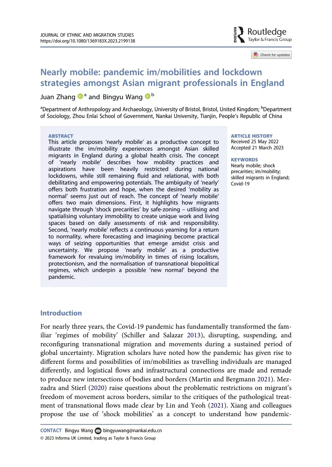 近期,南开大学周恩来政府管理学院社学系王炳钰教授(作为通讯作者)与布里斯托大学人类学与考古学系张娟副教授的最新合作文章于2023年4月12日在线发表于移民和族群研究顶刊Journal of Ethnic and Migration Studies (JEMS),文章题为Nearly mobile: pandemic im/mobilities and lockdown strategies amongst Asian migrant professionals in England。所发表期刊JEMS为英文核心期刊(SSCI)一区刊物(Journal Citation Reports-Q1);作为移民研究国际权威刊物,JEMS在JCR“族群研究”与“人口学”两个类别均排名世界第1,在谷歌学术“移民研究”和“社会学”两个类别的世界排名分别为第1和第2。本期推文将对这篇文章的研究问题、研究发现以及主要贡献进行介绍。