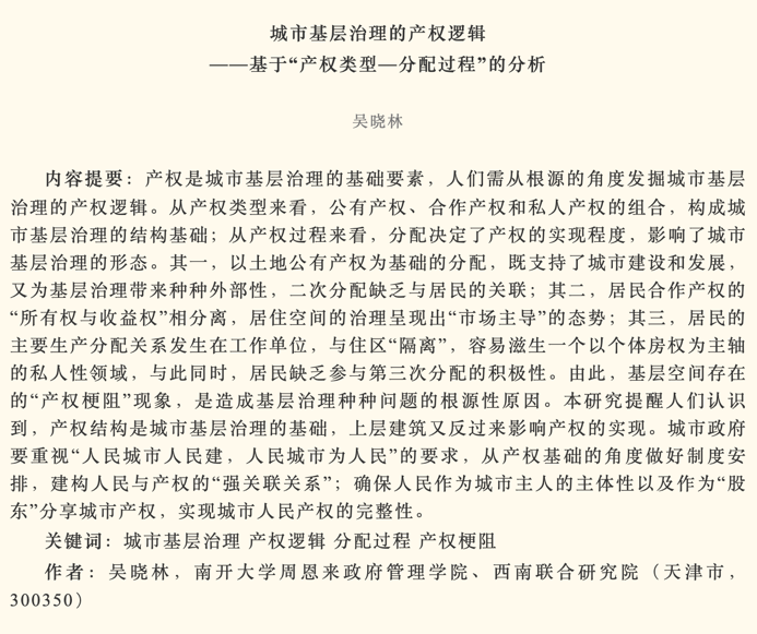南开大学周恩来政府管理学院吴晓林教授在2024年第3期的《政治学研究》发表文章《城市基层治理的产权逻辑——基于“产权类型—分配过程”的分析》。文章从产权类型和产权过程分析了城市基层治理的产权逻辑,指出基层空间存在的“产权梗阻”现象是造成基层治理种种问题的根源性原因。文章启示产权结构是城市基层治理的基础,上层建筑又反过来影响产权的实现。城市政府要重视“人民城市人民建,人民城市为人民”的要求,从产权基础的角度做好制度安排,建构人民与产权的“强关联关系”;确保人民作为城市主人的主体性以及作为“股东”分享城市产权,实现城市人民产权的完整性。