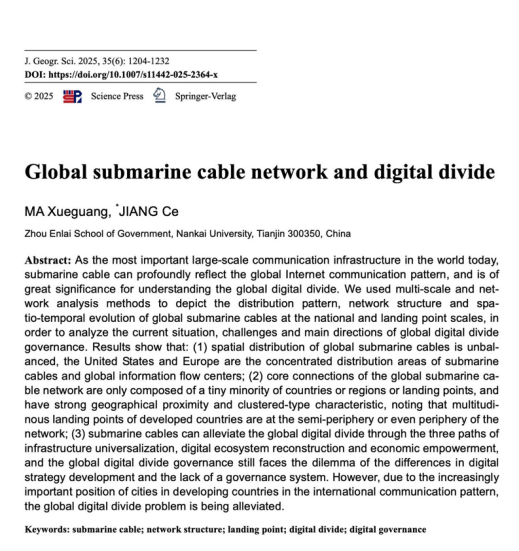 近日,周恩来政府管理学院教授马学广与其指导的博士生蒋策合作完成的论文“Global submarine cable network and digital divide”发表在地理科学领域国际权威SCI期刊Journal of Geographical Sciences(https://doi.org/10.1007/s11442-025-2364-x)。