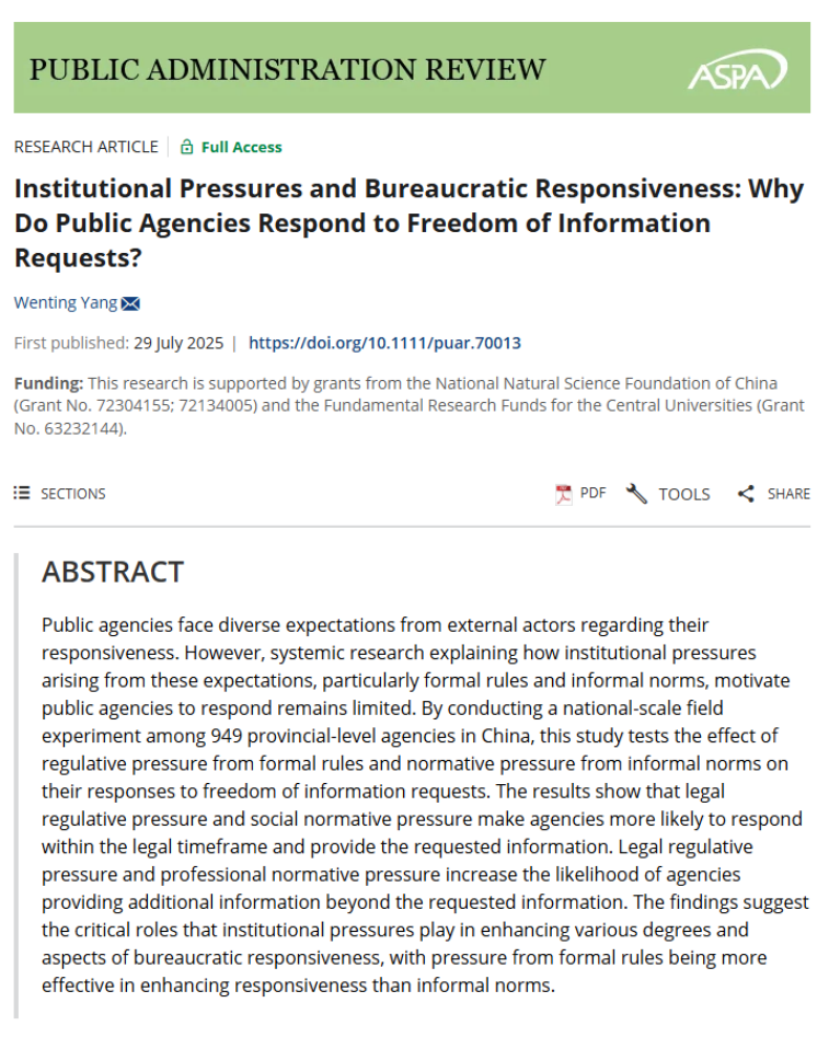 近日,南开大学周恩来政府管理学院杨文婷老师的独著论文“Institutional Pressures and Bureaucratic Responsiveness: Why Do Public Agencies Respond to Freedom of Information Requests? ”(《制度压力与官僚回应:公共部门为何回应信息公开申请?》)被公共管理国际顶级期刊Public Administration Review(PAR)录用并在线发表。PAR创刊于1940年,五年平均影响因子为7.3,在90本公共管理国际期刊中排名第一,是公共管理领域最负盛名的学术期刊之一。