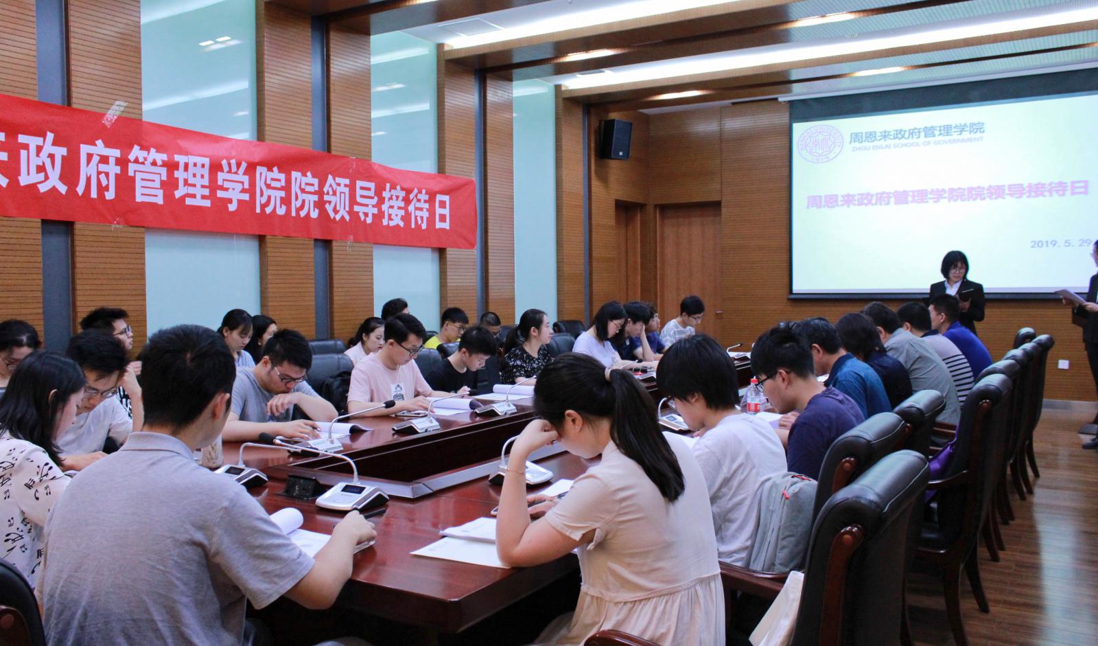 (通讯员:郑宗鹏 孔航)5月29日上午,周恩来政府管理学院院领导接待日活动在院楼144会议室举办。学院党委书记王慧,院长孙涛,副院长程同顺,党委副书记、副院长高磊,团委老师郑宗鹏及各年级学生代表出席了本次活动。