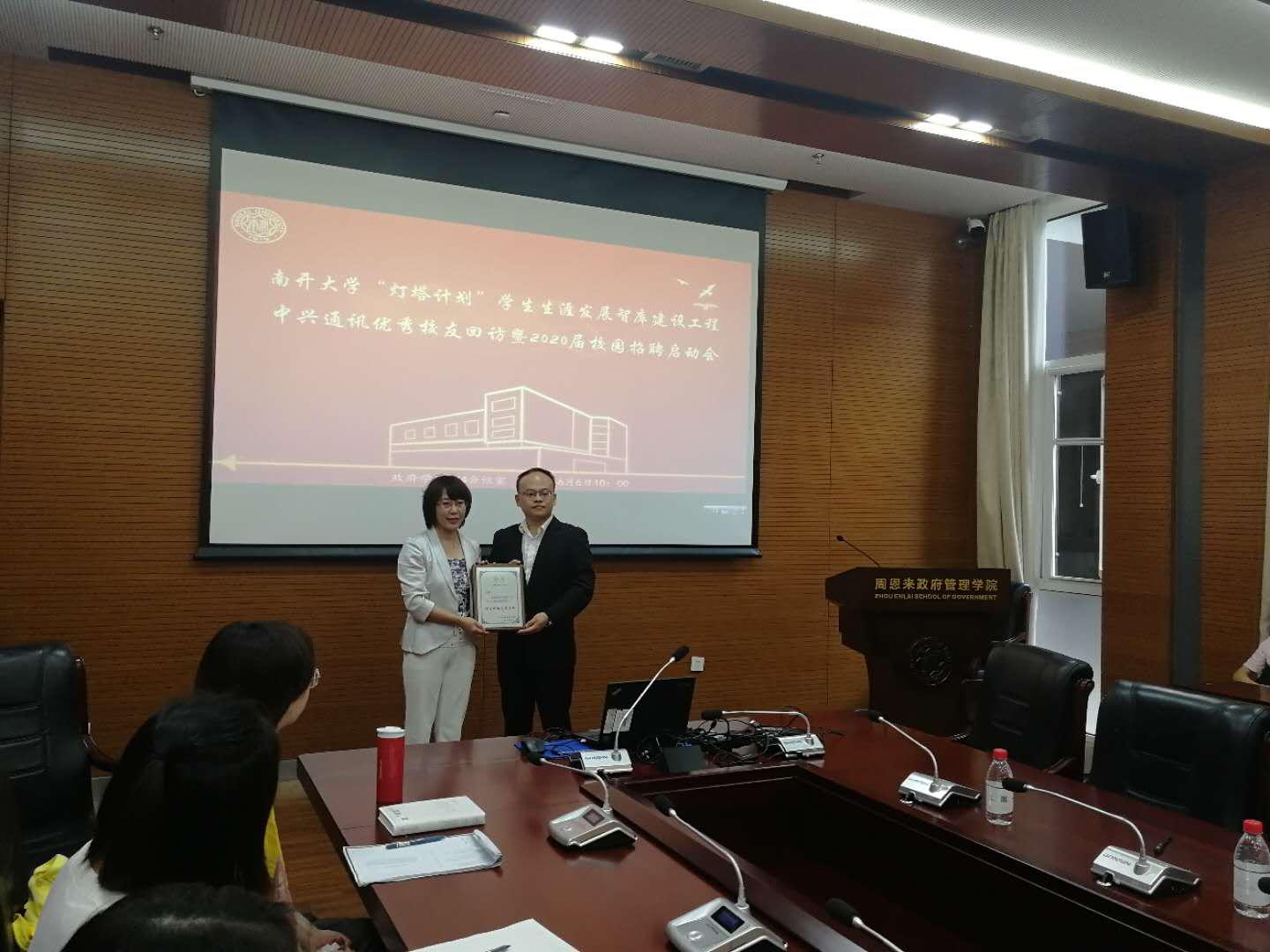 南开大学“灯塔计划”学生生涯发展智库建设工程之中兴通讯优秀校友回访暨2020届南开校园招聘启动会于2019年6月6日上午在周恩来政府管理学院成功举办。毕业于政府学院社会心理学系的2010届校友、中兴通讯亚太及独联体海外营销事业部人力资源总监王楠回访母校,中兴通讯人力资源专员陈芳芳、政府学院党委书记王慧、以及辅导员代表、学生代表参加活动。活动由政府学院党委副书记兼副院长高磊主持。