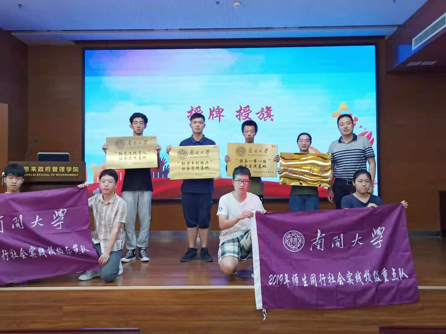 高磊老师向2019年实践队代表授实践基地牌、南开书屋牌,授实践队队旗;全体实践队员集体宣誓,志实部负责人高鑫领誓。同学们表示必定不负重托,践行知中国服务中国的南开精神,牢记允公允能校训,用实践丈量祖国大地,做好本次政府学院的暑期社会实践。