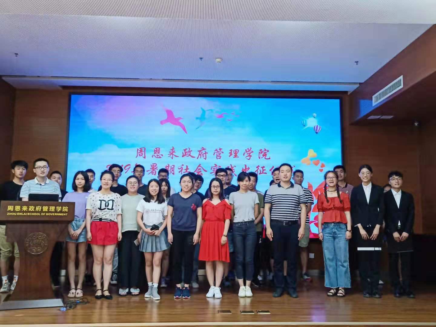 (通讯员:王燕、杨晶晶)6月26号下午3点,周恩来政府管理学院2019年暑期社会实践出征仪式在院楼128教室成功举行,学院党委副书记、副院长高磊,实践队代表老师马原,和来自24支暑期实践队的学生代表共同参加了本次出征仪式。