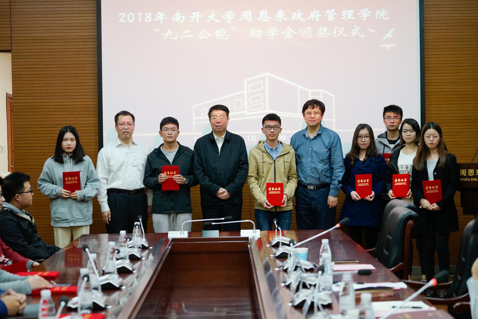 10月19日,2018年南开大学周恩来政府管理学院“九二公能”励学金颁奖仪式于政府学院144会议室成功举办。南开大学党委常委、副校长朱光磊,捐赠方代表、政治学系1992级校友、南开大学膳食服务中心主任蓝海,周恩来政府管理学院院长孙涛出席本次颁奖仪式。周恩来政府管理学院党委副书记兼副院长高磊主持本次颁奖仪式。此次颁奖仪式共由1992级校友代表、政府学院师生代表等40余人一同参加。来自政府学院的20位品学兼优、家庭经济困难的南开学子获得资助。
