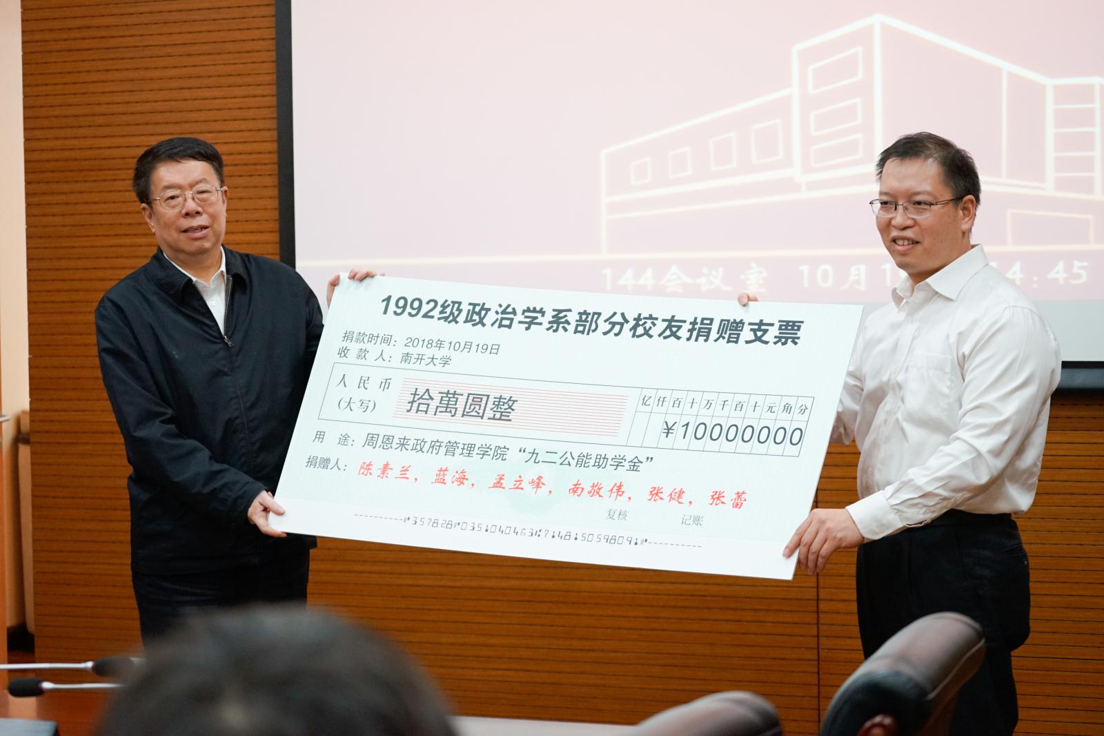 据了解,“九二公能”励学金于2016年首次颁发,由政治学系1992级部分校友捐资在周恩来政府管理学院设立,捐资总额为人民币50万元,分5年捐赠。该励学金旨在帮助勤奋好学,有“公”之志向、“公”之操守、“公”之襟怀的全日制在学学生顺利完成学业,期冀他们早日回报社会、回报母校。