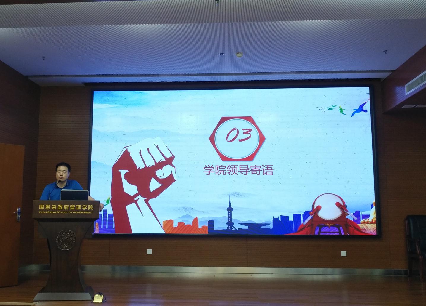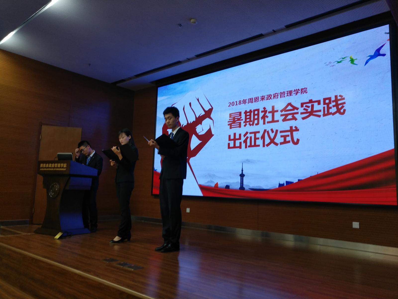 7月11日,周恩来政府管理学院2018年暑期社会实践出征仪式在周恩来政府管理学院院楼128教室举行。学院党委副书记兼副院长高磊、团委老师王燕以及各实践队代表参加本次大会。