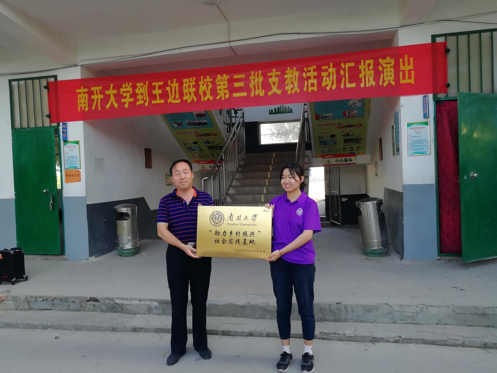 汇报演出结束后,由实践队长王静文代表南开大学向王边联校王校长授予“助力乡村振兴”社会实践基地铜牌,双方的合作进一步加深。