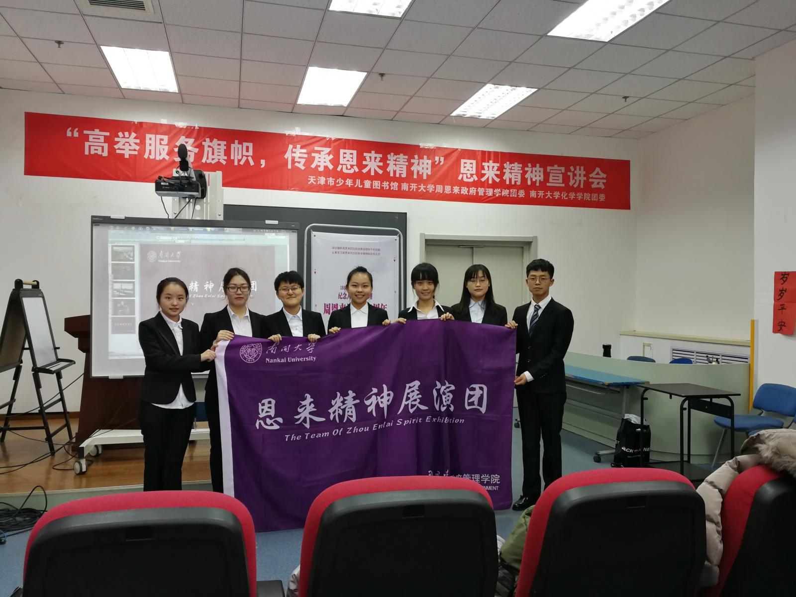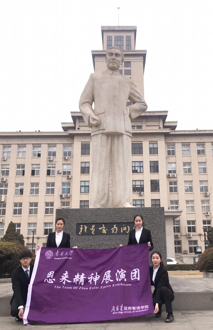 恩来精神展演团成立于2005年,是隶属于周恩来政府管理学院团委的学生组织,致力于通过生动的总理故事和丰富的图片、视频资料,讲述恩来事迹,传播总理精神,使周总理的形象在南开学子心中永葆鲜活,使总理精神始终照耀南开学子的成长道路。据悉,展演团近期还将举办恩来文化展、清明展演等活动。(通讯员:张琰、彭月圆)