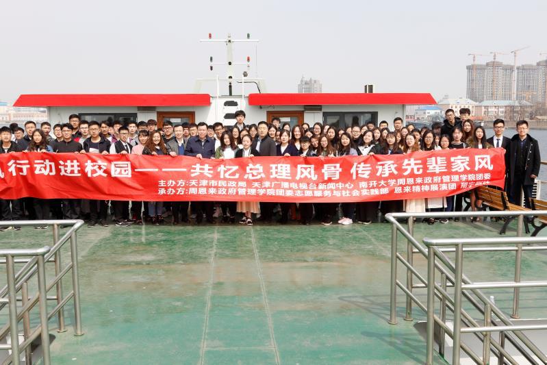2018年3月30日上午,由周恩来政府管理学院团委联合天津市民政局殡葬事业管理处等单位共同举办的“清风行动进校园——海河共忆总理风骨 南开传承先辈家风”活动在周恩来总理诞辰120周年之际于春意盎然的海河之滨顺利举行。