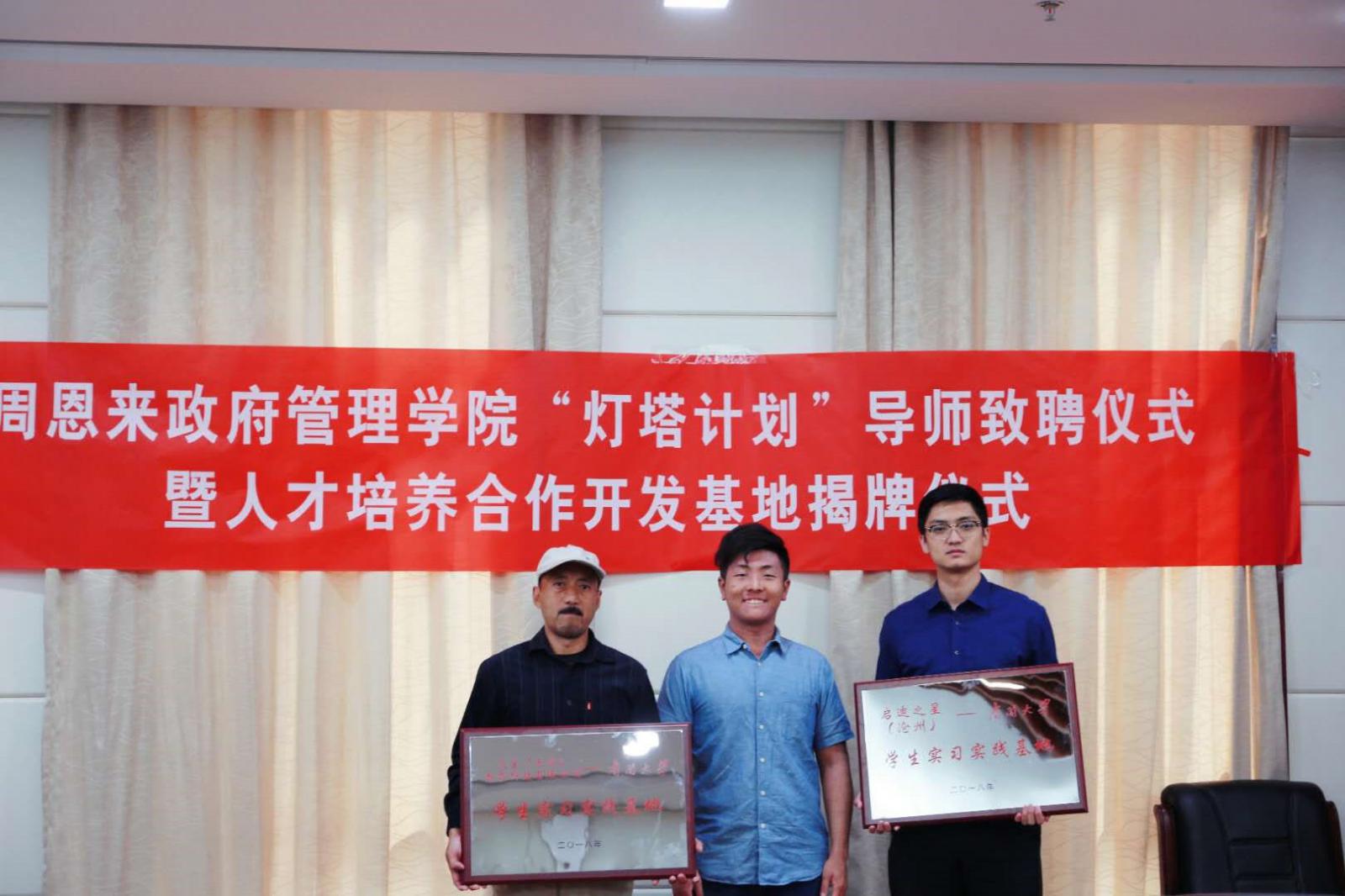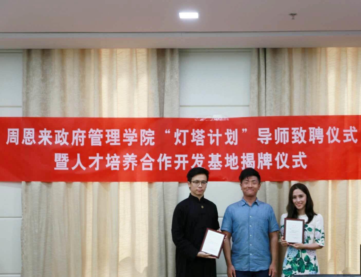 为扩展我院“灯塔计划”学生生涯发展智库,团委科技创新部积极联络邀请,于活动伊始进行周恩来政府管理学院“灯塔计划”导师致聘仪式暨人才培养合作开发基地揭牌仪式,与两位创业实践导师、职业发展导师、两个人才培养合作开发基地确立合作关系。