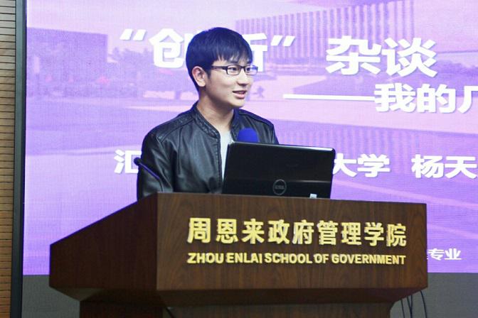 10月19日、23日晚,周恩来政府管理学院团委科技创新部主办的“政青春,创未来”创新创业主题分享会在学院报告厅举办,指导教师耿欣伟、科技创新部负责同学出席本次活动,许捷、杨天威、王余意、栗伊萱作为嘉宾到场分享。