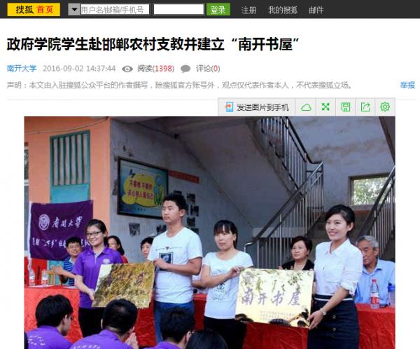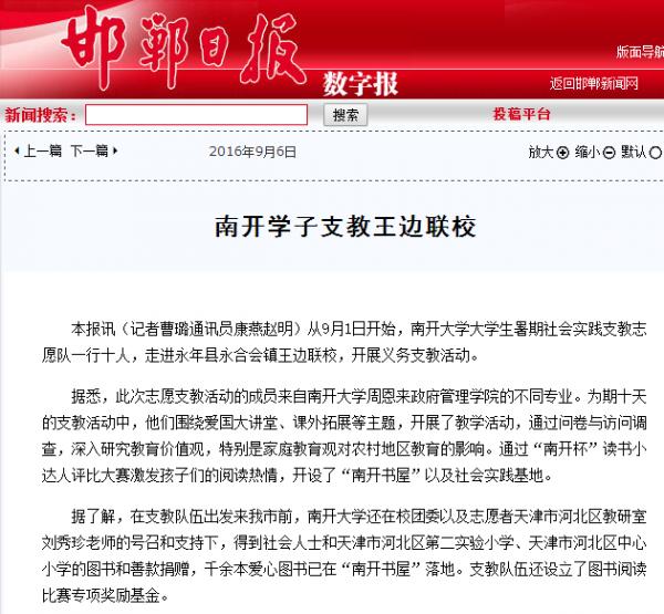 近日,南开大学周恩来政府管理学院十名学生赴河北省邯郸市永年县永合会镇王边村联合学校开展大学生暑期社会实践活动。此次活动以“莘莘学子传支教美德,情系乡土扬公能精神”为主题,进行为期十天的支教。在为小学生开设课程的同时,实践队员们还完成了课题调研、建立南开书屋、建设社会实践基地等任务。此次活动是南开学子知行合一的良好实践,积极响应“精准扶贫”国家政策要求,极大地促进了文化、科技、卫生“三下乡”事业发展,受到了搜狐新闻、凤凰资讯、邯郸电视台、邯郸日报与邯郸晚报等多家媒体的关注与报道,下附部分报道截图。