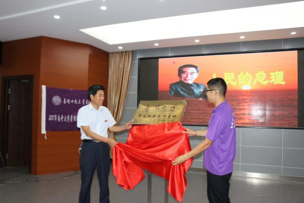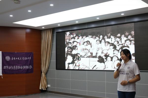 下午四点,在参观过后,实践队的同学同纪念馆的讲解人员一道为周恩来纪念馆的内部人员进行一场生动而又精彩的展演。活动伊始,恩来精神展演团负责人杨铭和周恩来纪念馆副馆长顾永丰进行了南开大学社会实践基地挂牌交接仪式。接下来,双方交换纪念品,展演团向纪念馆赠送了恩来故事中英对译纪念集以及南开大学纪念品,周恩来纪念馆向展演团赠送了周恩来水晶雕像以及周恩来生平业绩陈列展览图集。南开大学兼职辅导员杨铭依托建党96周年、总理诞辰119周年等重要时间节点进行致辞并对此次实践活动提出期待与展望。活动第三项,展演团以故事的形式向大家传递了恩来精神。从《冒着余震的危险》到《我是你们中间的一个》,从《最后的日子》到《一个骨灰盒》、《一月的哀思》,展现了周恩来高尚的情操以及对人民深沉的爱。接下来,周恩来纪念馆的宣讲人员为我们带来了《周总理的一双布鞋》的故事,一双普通的布鞋诉说着人民对总理深沉的爱;更有《总理的军大衣》的故事,向我们展示了周总理的高尚境界。