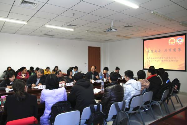 研讨会围绕“聚焦两会,共商国策”这一主题,以针对“经济新常态”等出现在政府工作报告中的新提法词语的解读开始。随着研究生一年级行政管理专业的庞强同学的见解分享,同学们逐步融入讨论中,纷纷就自己感兴趣的问题与老师和同学进行交流。从市场控制碳排放的趋势到当代中国房屋供给与需求问题,李晨光老师和郑飞北老师分别阐述独到见解。在研讨交流环节中,有关教育改革的相关问题引发了在场师生的极大关注,从农村基础教育和初中教育水平的提高问题、教育公平和教育精准扶贫问题到与同学们息息相关的高考改革的未来方向问题,老师和同学们纷纷提出自己的见解。除此之外,师生还就城乡一体化牧民职业转型问题以及如何尊重民族多样性等问题进行讨论,思维的火花在研讨交流中不断迸发。