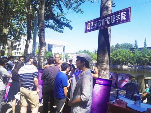 来自政治学类、社会学类、行政管理、城市管理等专业的教师、学生志愿者组成政府学院招生宣传队,为广大考生及家长提供高考招生咨询服务。早晨八点多,工作人员布置好展位,迎接陆续到来的考生及家长。随后,龚克校长亲临我院展位,与政治学系主任程同顺教授亲切交谈。龚克校长询问了我院招生宣传工作的具体安排,并竖起拇指为政府学院“点赞”。