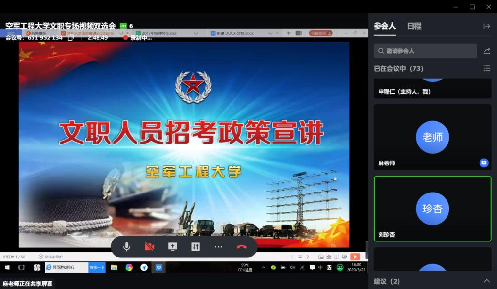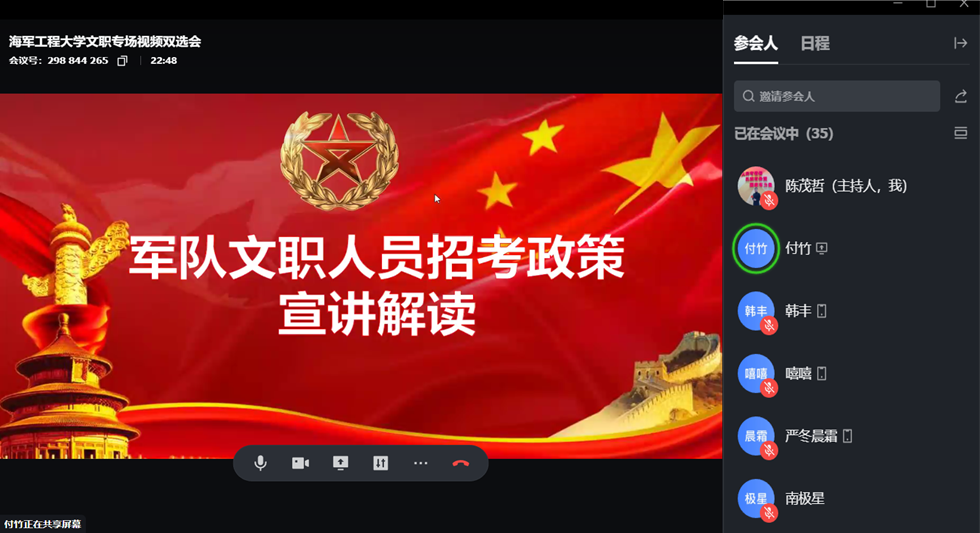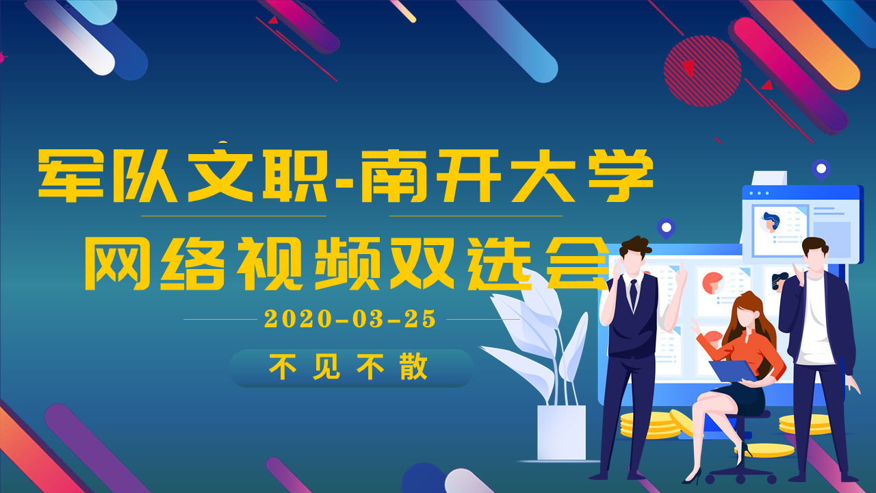 (通讯员:杨晓颖 鲍文海 岳庆磊)为深入贯彻落实习近平总书记统筹做好新冠肺炎疫情防控和经济社会发展的重要指示精神,确保毕业生就业工作不断线,由南开大学学生就业指导中心主办,周恩来政府管理学院承办的“军队文职专场网络视频双选会”于3月25日下午顺利举办,11家军队单位招聘负责人做客网络会议室,提供就业岗位987个,参与学生达1000余人次。