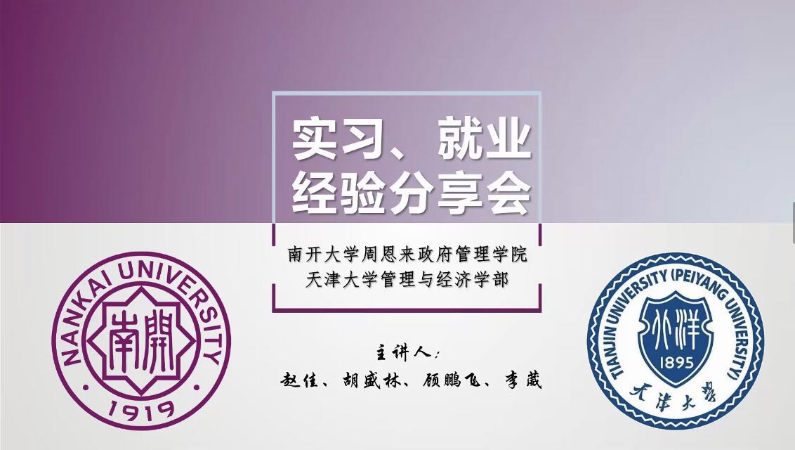 (通讯员:杨晓颖 王瑾)4月17日晚,政府学院“求职训练营”系列活动—就业实习经验分享会顺利举办。此次活动由南开大学周恩来政府管理学院主办,天津大学管理与经济学部协办。本次分享会通过线上视频会议与一对一问答的形式,邀请了两校四位就业实习经验丰富的毕业生进行经验分享,一百五十名学生观看直播。