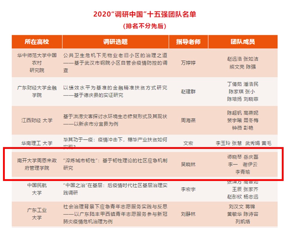 据悉,“调研中国”是一个由南风窗杂志社于2005年创办的公益项目,其全称是“调研中国—大学生社会调查奖学金”,通过提供资金和专业培训,支持在校大学生进行田野调查和社会实践。迄今为止,全国已有700所高校,10000多支团队参加了“调研中国”,影响了100多万大学生群体。本调研团队是我校唯一一支入选全国15强的队伍,调研成果对研究韧性社区在社区应急防控和后疫情时代社区治理体系构建中具有重要意义。天津市在今后社区发展中,要将风险治理与韧性社区相结合,提升社区治理效能。