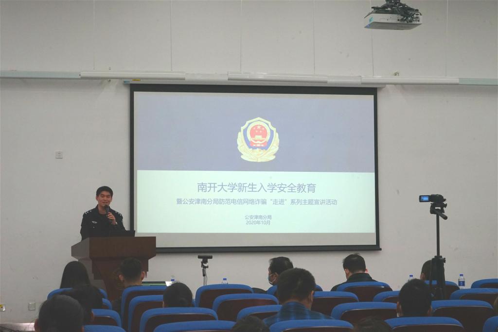 (通讯员:惠如 摄影:钱星宇)2020年10月22日下午,周恩来政府管理学院2020级本科新生在津南大通学生活动中心F202多功能厅开展了新生入学安全教育培训讲座暨国防、安防、形势政策教育。保卫处特邀请公安津南分局研究宣传科民警牟心宇警官开展安全教育培训。公安津南分局治安管理支队内保大队大队长王勇、副大队长张昕,公安津南分局同砚路派出所教导员张文毅,南开大学保卫处副处长聂士杰,周恩来政府管理学院党委副书记兼副院长宋媛出席讲座,周恩来政府管理学院辅导员东韡妍主持。
