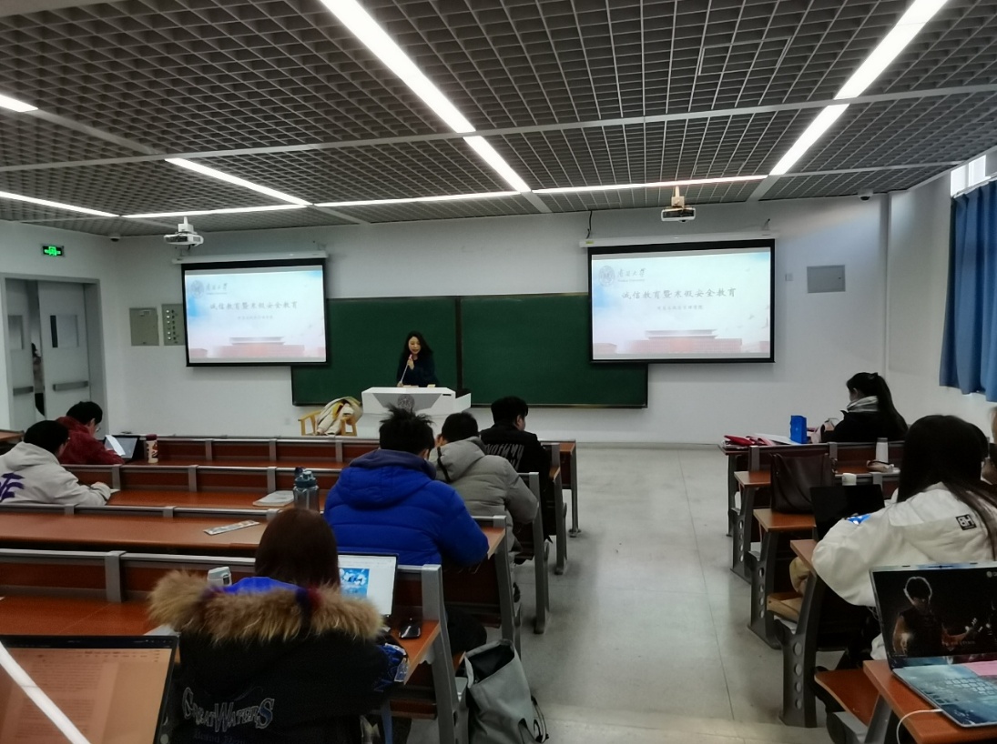 大会伊始,2019级本科生辅导员娜菲沙首先介绍了2019级本科生的考试安排,之后从《南开大学学生违纪处分暂行规定》和《南开大学学生考试违纪和作弊的认定及处理办法》等文件规定出发向大家开展考试诚信教育。详细讲解了各类考试违纪行为对应的处理办法,从通报批评、警告或严重警告、记过、留校察看、不授予学士学位、开除学籍层层递进,告诫同学们考试作弊的严重后果,并通过实际案例警示大家引以为戒,切勿抱有侥幸心理。随后,叮嘱大家要高度重视寒假期间的安全问题,包括留校学生的宿舍安全、离校返家途中安全以及防疫安全,做好安全防范。