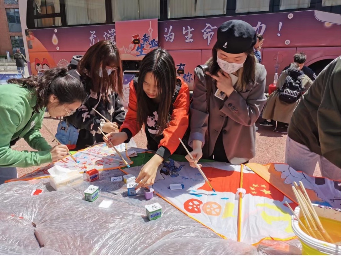 线下路演活动在春意盎然的南开园中开展。活动展出了各具特色、寓意丰富的手绘风筝,吸引了过往的老师和同学。大家共同精心绘制风筝载着同学们对党和国家的美好期盼与祝福乘风翱翔,将此次活动引向高潮。