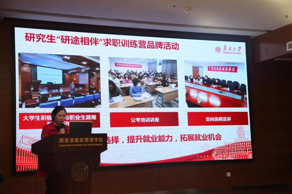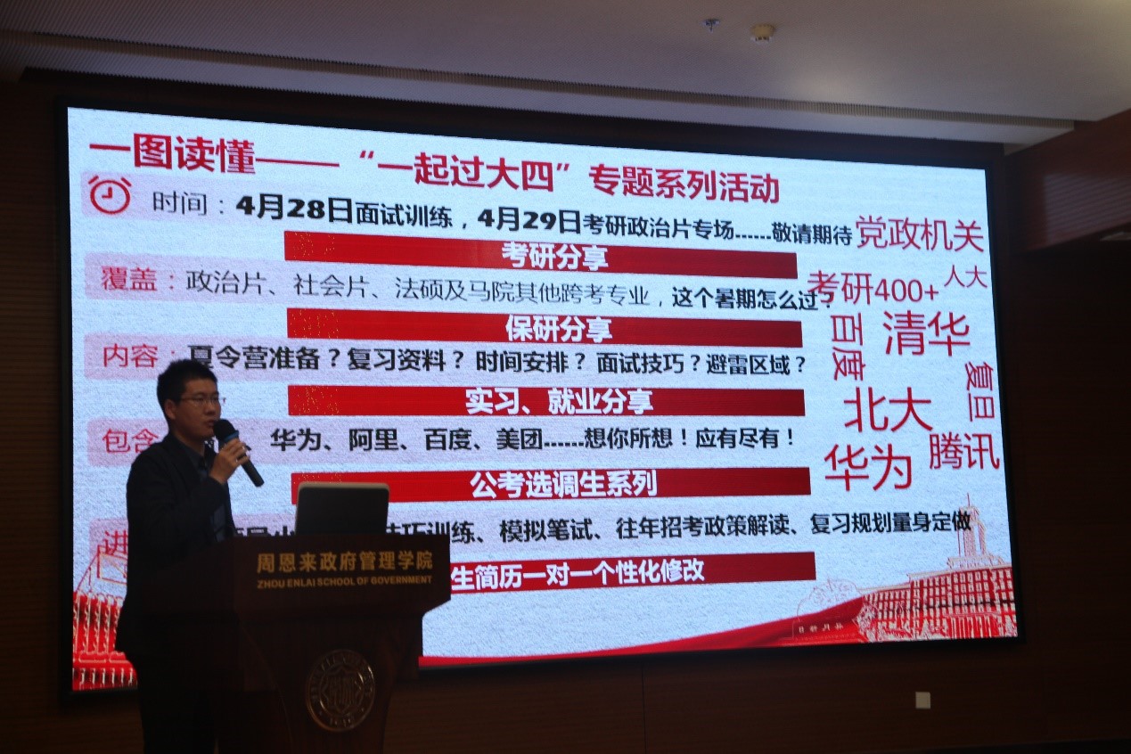 4月26日,南开大学周恩来政府管理学院成功举办2022届就业启动会。学院党委副书记兼副院长宋媛,学院团委书记杨晓颖,辅导员王燕、郑宗鹏、王若瑶出席,学院近两百名本科及研究生参加。