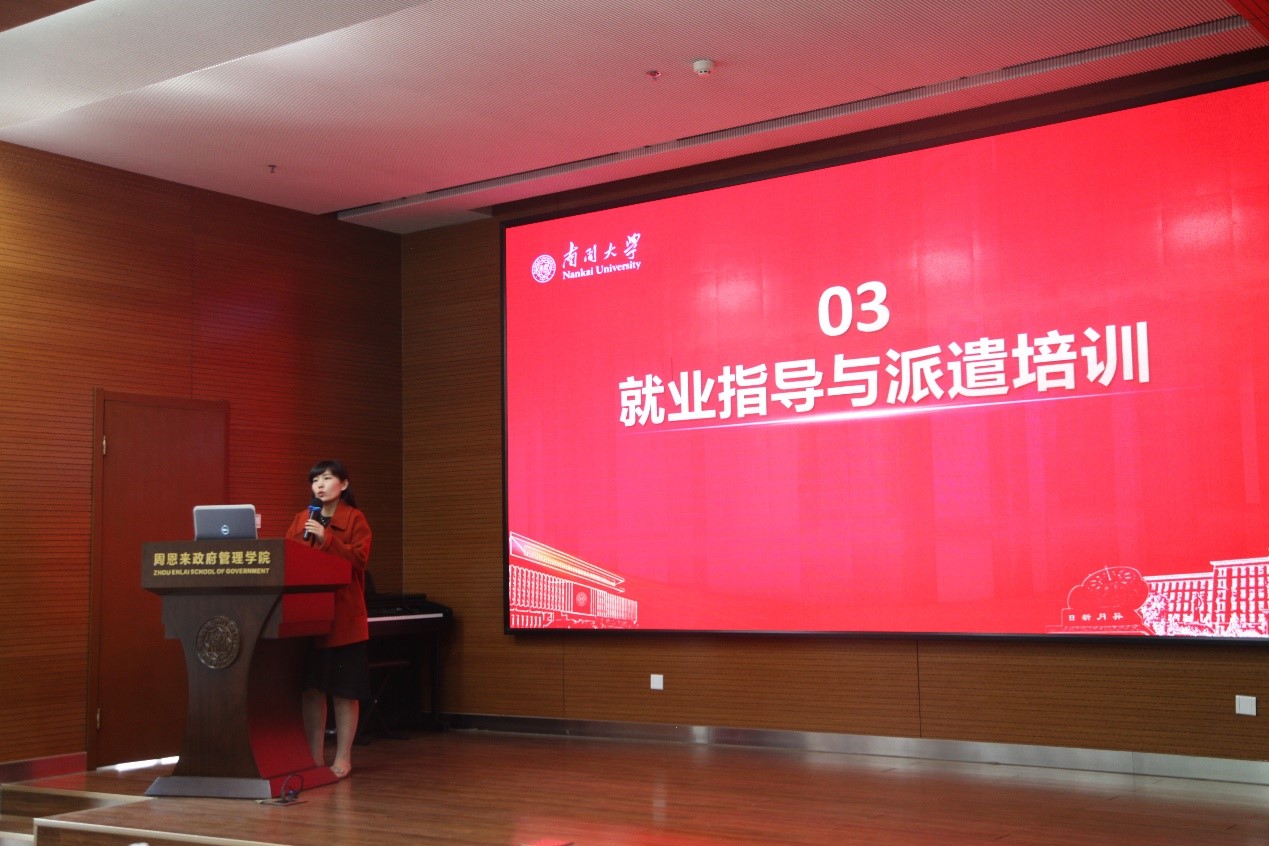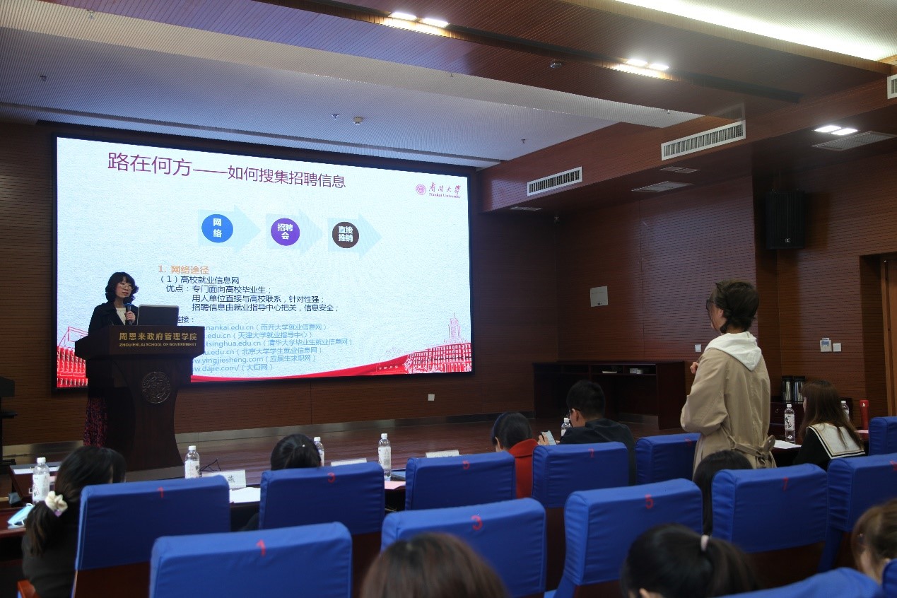 宋媛老师在就业形势与政策分析中鼓励毕业生坚定理想信念,将小我融入大我,倡导同学们到中西部基层就业、到国家重要的战略领域就业。杨晓颖老师以就业大数据为切入点,详细培训毕业派遣手续,并现场演示南开大学就业系统使用方法。