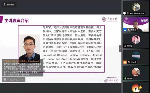(通讯员:郑宗鹏 张子辰 谢田橙)为更好丰富南开学子假期学习生活,营造疫情期间良好的学习氛围,1月23日上午,政府学院成功举办南开大学国策论坛线上讲座活动,为广大南开学子提供了一场对话专家学者、提升能力素养的学术盛宴。本次活动邀请到周恩来政府管理学院教授、博士生导师、国家级青年人才项目入选者赵聚军老师作为主讲嘉宾,赵聚军老师围绕“建党百年的行政区划策略的演进与新时代行政区划调整的三重逻辑”的主题,为同学们带来了一场内容充实的精彩讲座。