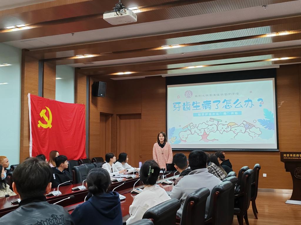(通讯员:东韡妍 摄影:段煜坤)为深入贯彻落实习近平总书记关于“健康是幸福生活最重要的指标”的重要指示精神,加强学院间共建交流,提升支部成员的健康意识,4月20日,周恩来政府管理学院政治学本科生党支部邀请医学院思源宣讲团进行“牙齿生病了怎么办”的主题宣讲。