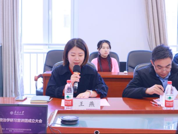 周恩来政府管理学院团委书记王修彦老师代表学院团委讲话,他表示:学院团委将大力支持宣讲团开展各项活动,同时研习宣讲团的成立与发展,要紧扣学院与政治学系的重要安排部署,努力建设成为学生内部凝聚的主要阵地、对外交流的重要力量。