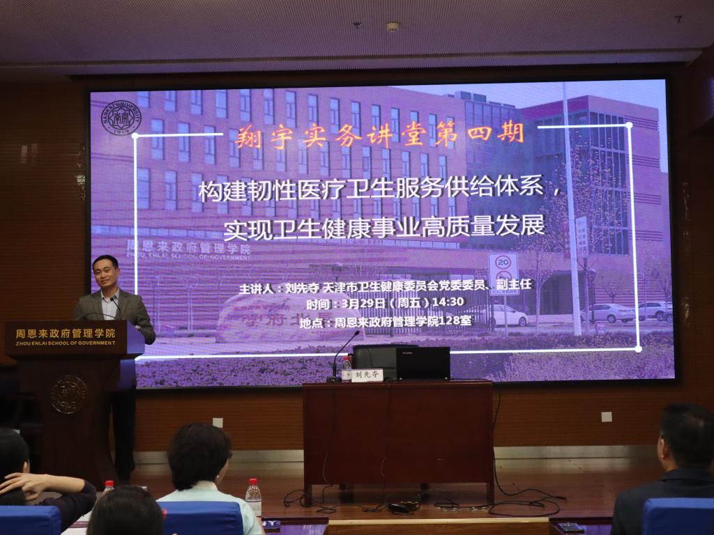 (通讯员 王燕 严正杰)2024年3月29日,南开大学周恩来政府管理学院“翔宇”实务讲堂暨中国经验进校园讲座第4期开讲。天津市卫健委副主任刘先夺同志受邀在南开大学做题为“构建韧性医疗卫生服务供给体系,实现卫生健康事业高质量发展”的讲座。南开大学周恩来政府管理学院党委书记王慧、周恩来政府管理学院副院长、中国政府发展联合研究中心副主任吴晓林教授、南开大学周恩来政府管理学院团委书记王修彦出席研讨。会议由南开大学周恩来政府管理学院祁艳玲教授主持,南开大学200多名师生参加。