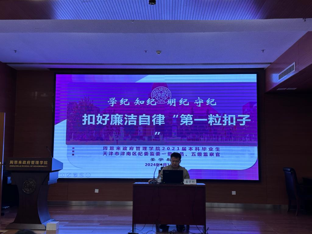 姜宇彤结合学校和学院实际,号召大家秉承南开爱国主义传统,弘扬恩来精神,坚定理想信念、遵守纪律规矩、发挥模范作用,扣好廉洁自律的“第一粒扣子”。