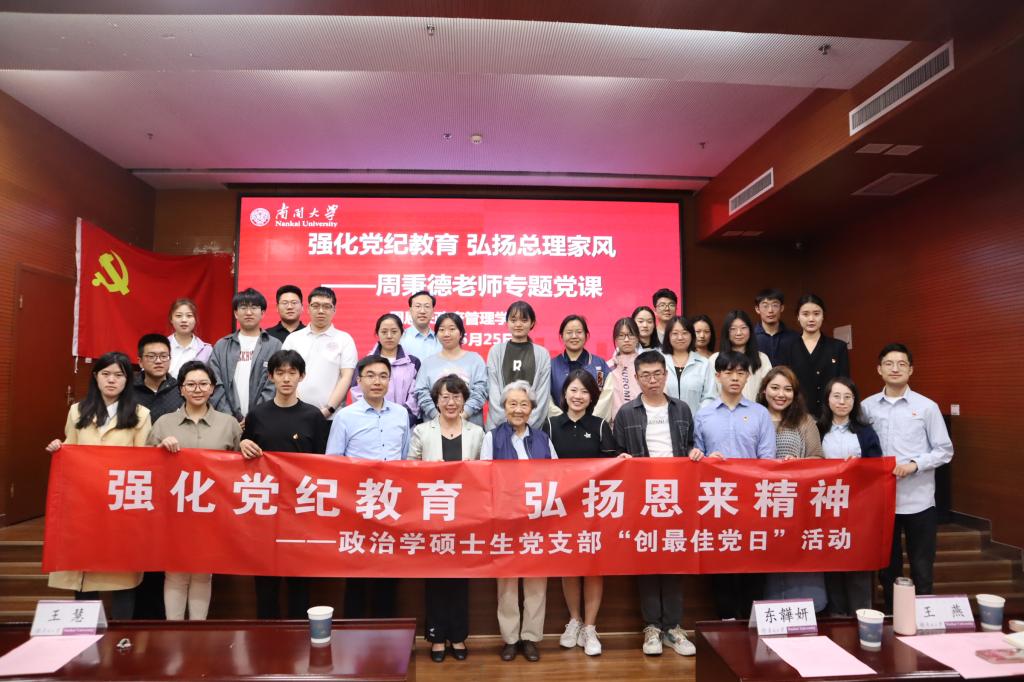 (通讯员:王燕 付昱)为认真贯彻落实习近平总书记来津、来校视察重要讲话精神,结合党纪学习教育要求,切实增强党员纪律意识,不断筑牢党团班一体化建设,5月25日,周恩来政府管理学院政治学硕士生党支部举行“强化党纪教育,弘扬恩来精神”创最佳党日活动。周恩来总理侄女、中国新闻社原副社长周秉德,周恩来政府管理学院党委书记王慧、团委书记王修彦、团委副书记王燕、团委辅导员娜菲沙、东韡妍以及第十四届周恩来班、南开政治学研习宣讲团、恩来精神展演团、恩来团校等团学组织学生代表参加活动。