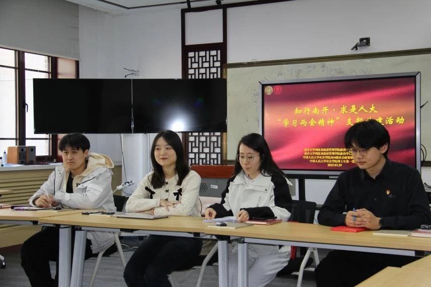 2025年3月29日下午,南开大学周恩来政府管理学院政治学本科生党支部、政治学硕士生党支部联合中国人民大学社会学院2024级社会政策硕士生党支部、博士生第一党支部在南开大学八里台校区举办“知行南开·求是人大——学习两会精神”支部共建活动。两校40名党员代表通过沉浸式展演、专题宣讲、小组研讨、校史展参观等多元形式,构建理论学习与实践研学的立体化教育矩阵,深化对全国两会精神的学思践悟。