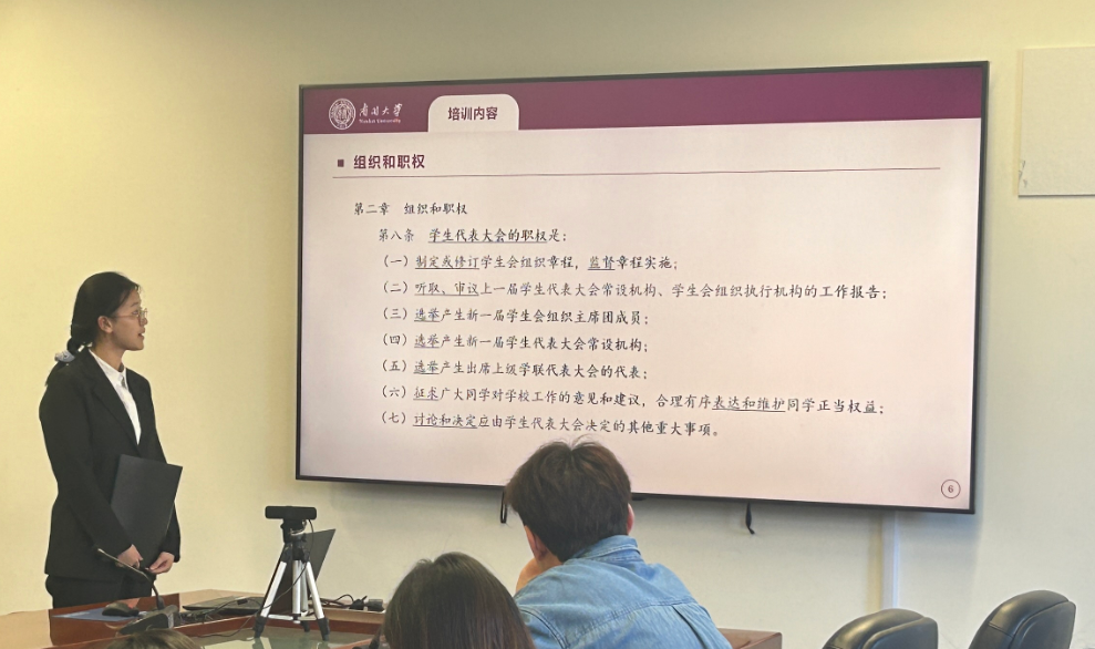 随后,会议进入第二项议程,周恩来政府管理学院学生委员会委员郭栋为代表们详细解读了学生代表的职责定位和相关规章制度。学生代表是连接学校、学院与同学们的重要桥梁,明确职责定位、熟悉规章制度是做好代表工作的基础。通过解读,学生代表更加清晰地认识到自己的职责和使命,更好地服务同学需求和学生工作发展需要。
