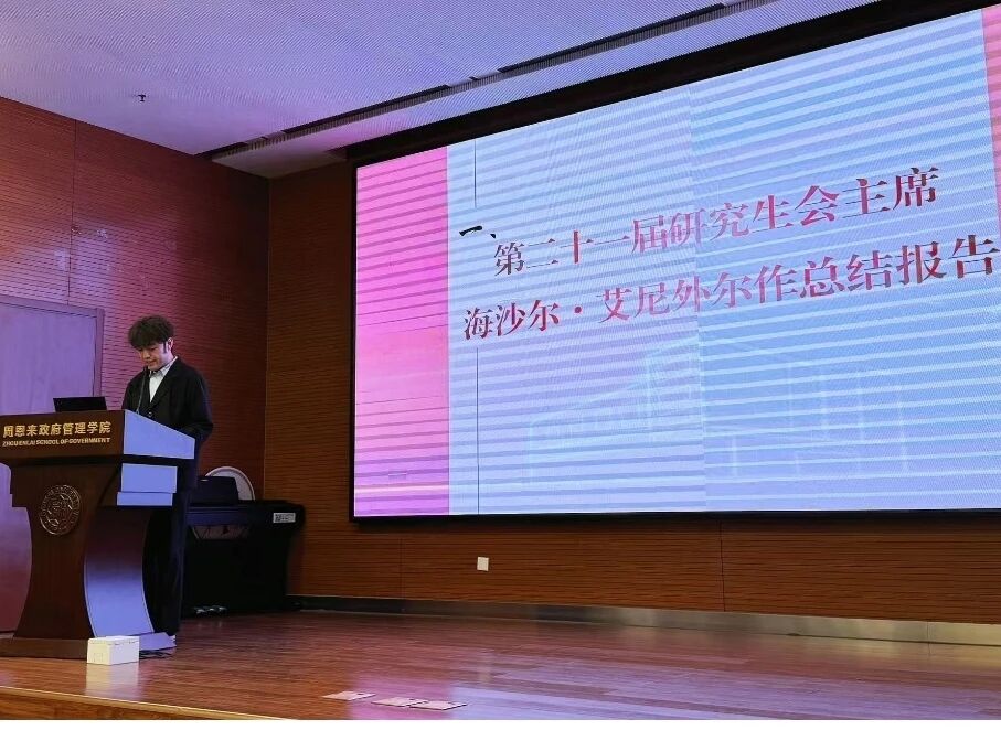 首先,政府学院第二十一届研究生会主席海沙尔·艾尼外尔回顾了过去一年的工作。他强调,在学院党委领导、团委指导下,深入贯彻习近平总书记关于青年工作的重要思想,研究生会在打造品牌活动、深化榜样引领、搭建沟通平台等方面作出了突出贡献。他指出,通过“导师有约”、“翔宇实务讲堂”等学术交流活动,不仅促进了学风建设,还为同学们营造了良好的学习氛围;同时,“权益树洞”、“校园护航”专栏的设立也进一步加强了与同学们之间的联系,切实解决了大家的实际问题。