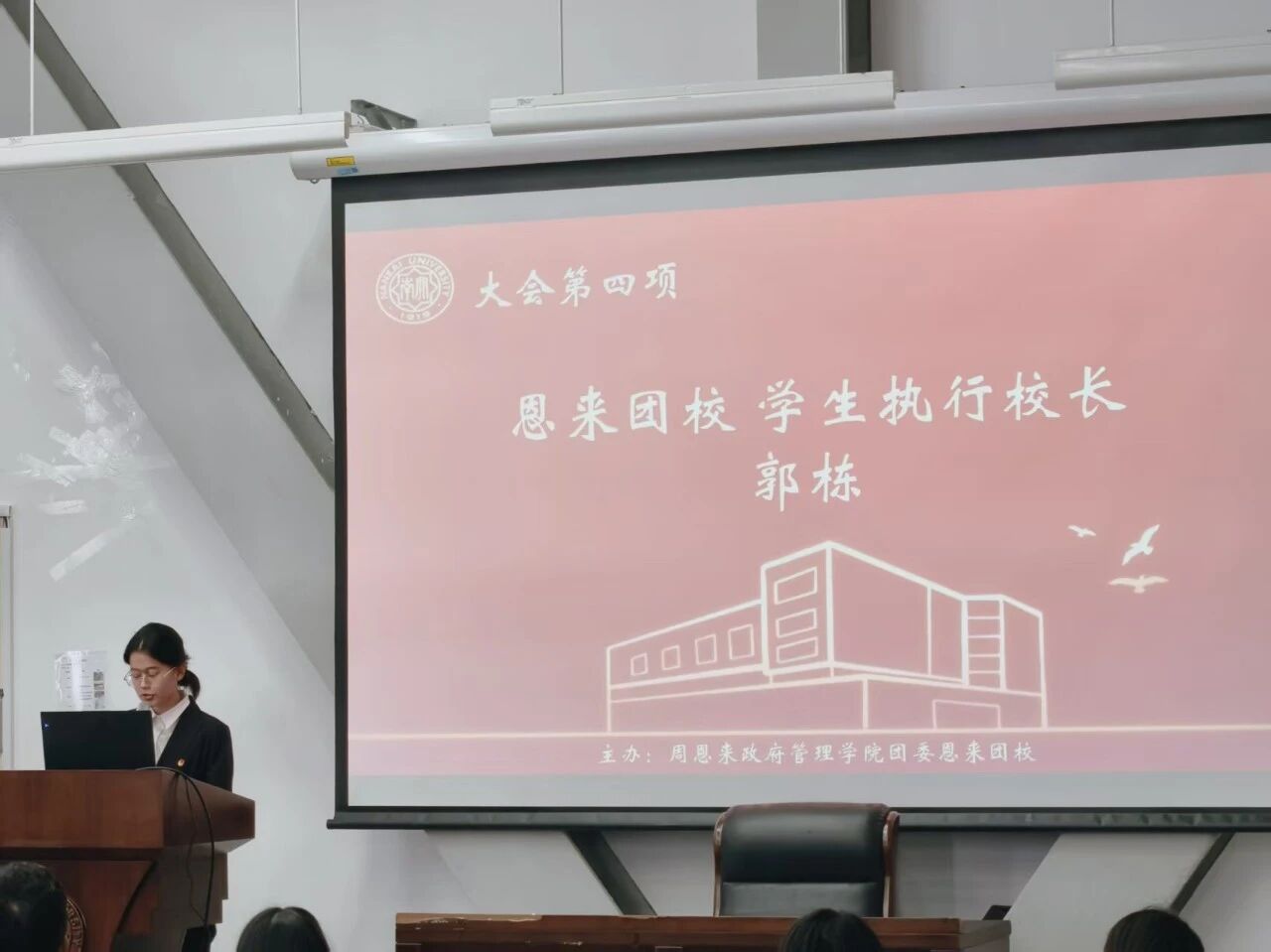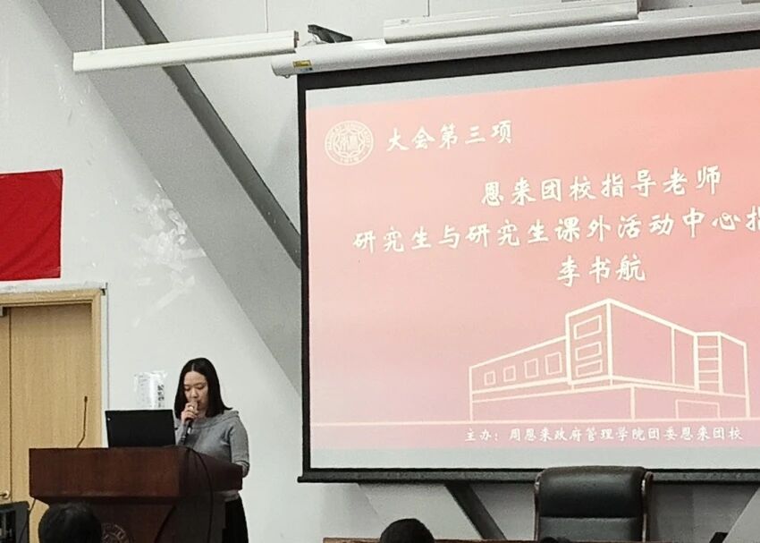 接着,主持人依次介绍了本次团课的到场嘉宾,分别是:马克思主义学院习近平新时代中国特色社会主义思想概论研究室助理研究员史猛老师、恩来团校指导老师、研究生会与研究生课外活动中心指导老师李书航老师、恩来团校学生执行校长 郭栋同学、恩来团校学生执行副校长石雨馨同学和付萧瑞同学。