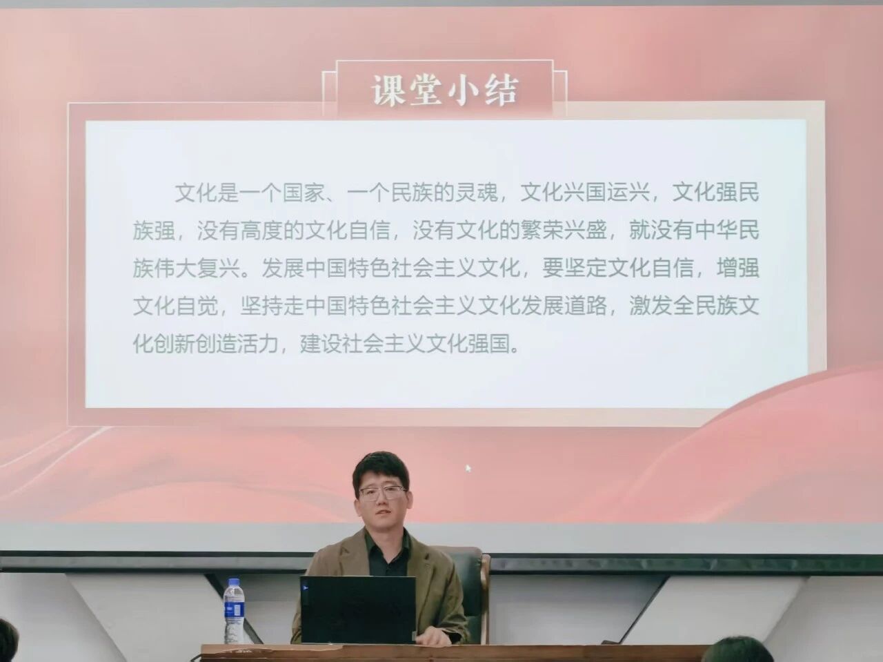 最后,史猛老师引用“文化是一个国家、一个民族的灵魂,文化兴国运兴,文化强民族强,没有高度的文化自信,没有文化的繁荣兴盛,就没有中华民族伟大复兴”,再次强调文化自信的重要性,勉励学员们要认同中国特色社会主义文化,坚持马克思主义在意识形态的指导地位,加强意识形态建设,树立社会主义核心价值观。