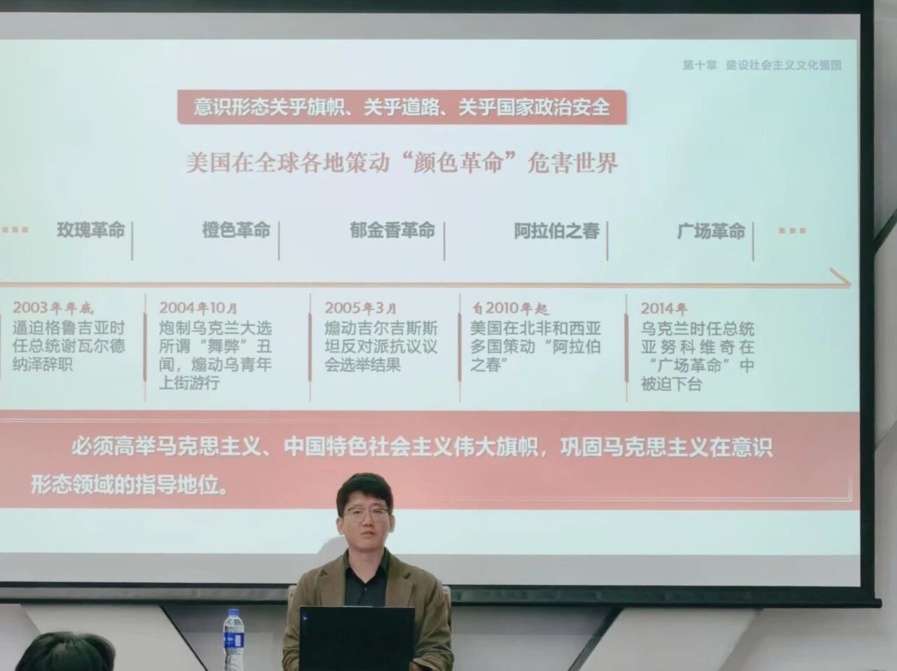 紧接着,史猛老师通过分析前苏联瓦解的例子,并结合当今网络时代的危险与机遇,阐述论证了马克思主义是当代中国文化发展的灵魂,并从“用习近平新时代中国特色社会主义思想武装全党”“提升党、国家和民族的凝聚力向心力”等五个方面论证得出了要“牢牢掌握意识形态工作领导权”。